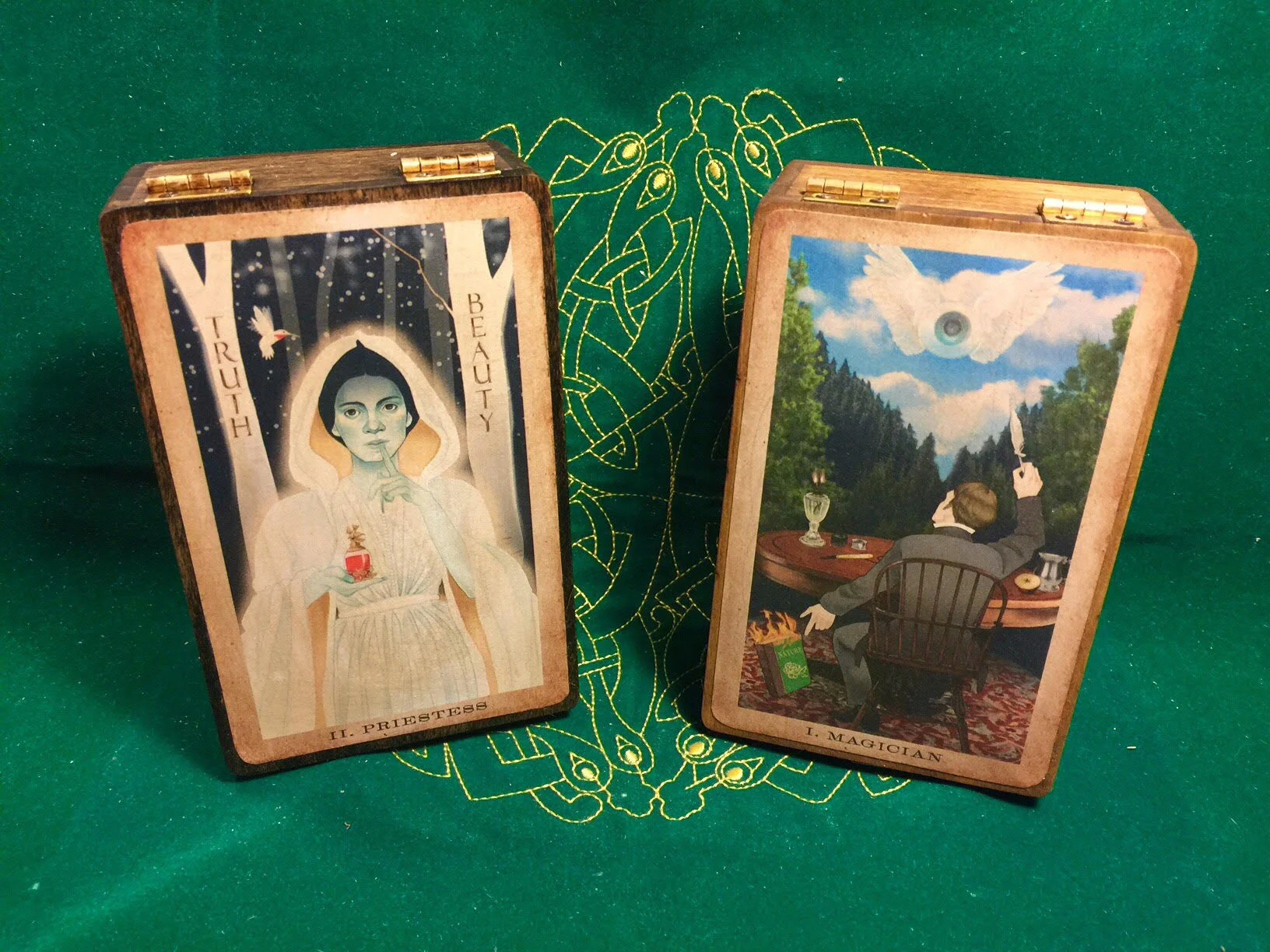 Marc Charisse of Warlocks Boxes has created two beautiful handmade Tarot boxes featuring images from The American Renaissance Tarot. Below is the rather humorous story of how we met. You will be placed in a drawing to win one of the boxes if you commission a card via our Indiegogo campaign.
