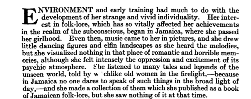 Image of the paragraph in the Craftsman magazine describing Pamela Colman Smith’s exposure to Afro-Jamaican culture.